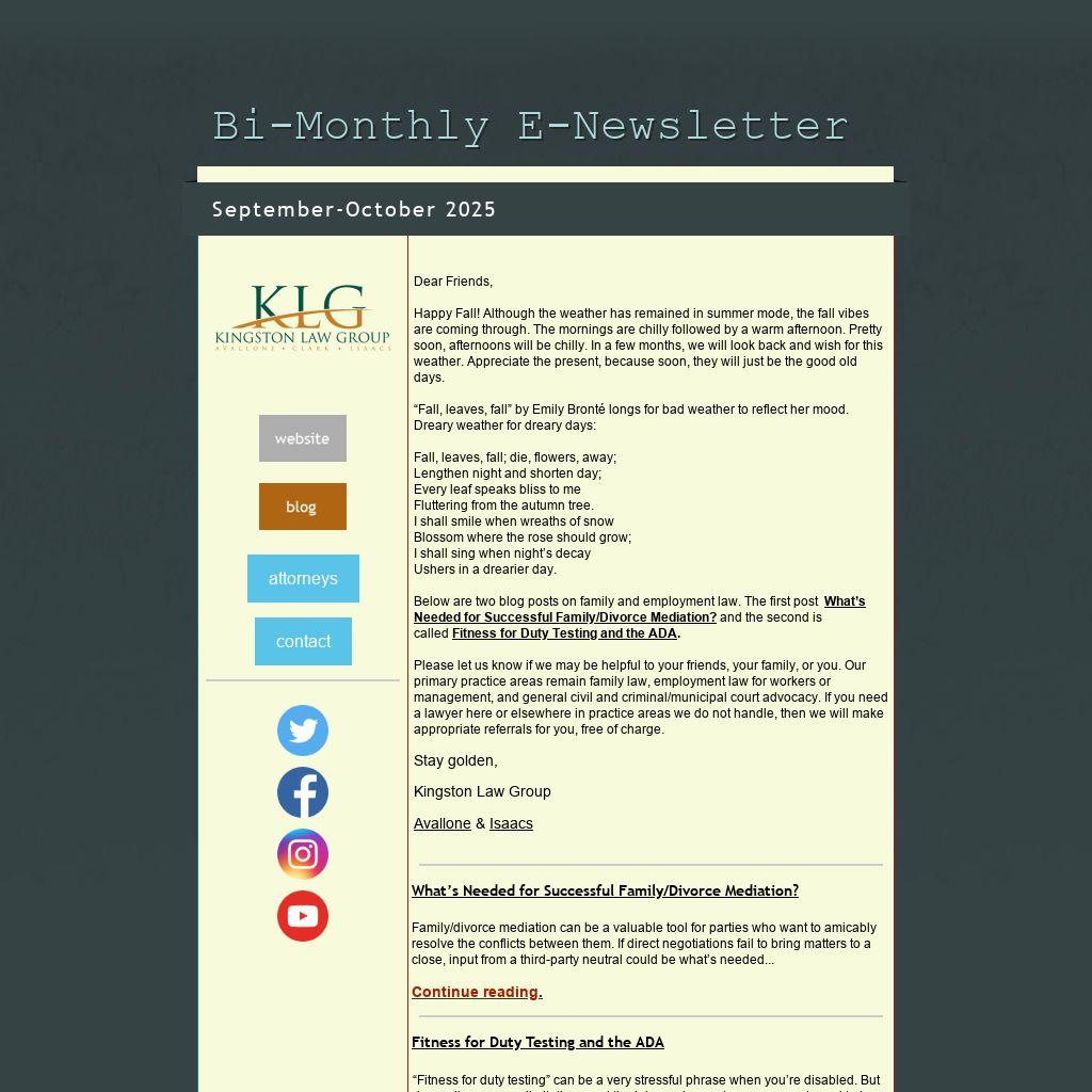 Please let us know if we may be helpful to your friends, your family, or you. Our primary practice areas remain family law, employment law for workers or management, and general civil and criminal/municipal court advocacy. If you need a lawyer here or elsewhere in practice areas we do not handle, then we will make appropriate referrals for you, free of charge.