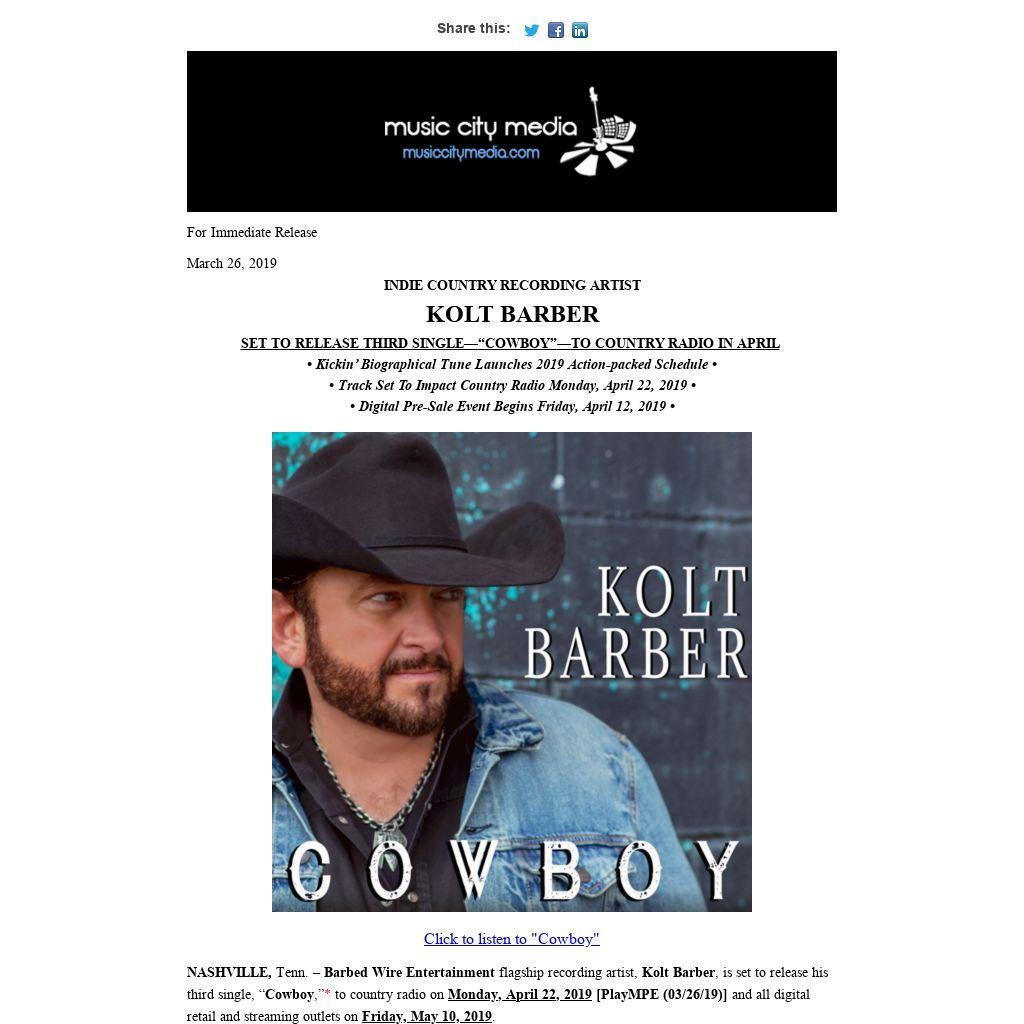 KOLT BARBER is just a good, ole boy—plain and simple. He is a hard-working, hands-on Georgia native who will be the first to say he has endured bumps and bruises from life mistakes; but with a cowboy spirit that runs deep, the maverick has the tenacity to get back on the horse. He is a devout patron of the land whose favorite canvas is painted from a front porch swing view that gazes across the crop fields and grazing horses. Marrying his passion for the land with his love for music, Kolt has spent years writing and performing before heartland country music fans. His dedication to his fellow blue-collar crop growers and livestock wranglers, and his country music following, make him a standout in both fields.