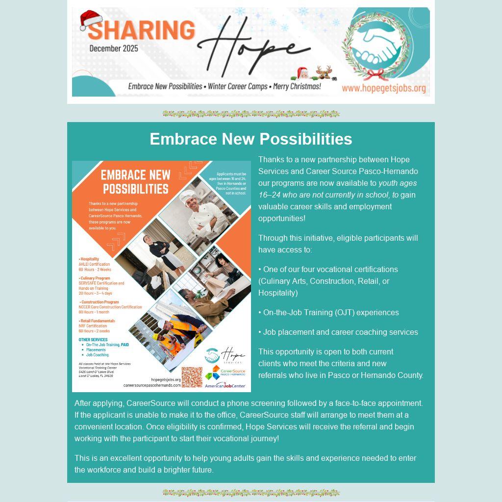 On behalf of the entire Hope Services staff, thank you for allowing us to be part of your life’s journey. We’re honored to earn your trust and support each day. Wishing you and your family a blessed Christmas and a joyful New Year.