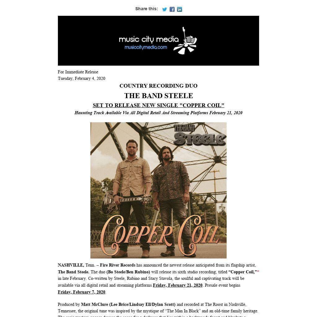 Their swift success captured the attention of media; the duo received the extended invitation to appear on “The Ty Bentli Show” and “TODAY In Nashville” (NBC-Nashvillle) among other local ABC, NBC and CBS TV affiliates, and on the nationally syndicated show, “Small Town Big Deal” (the September 2019 episode spotlights their acoustic performance of “Sit Awhile.”) The pair was invited to perform with the globally-recognized television show "Orange County Choppers (American Choppers)” both at their venue/showroom and at their booth at The New York International Auto Show. The Band Steele has provided direct support to various multi-platinum selling recording artists, including Maren Morris and Andy Grammer, and a Band Steele original tune, “Good Times,” is featured in the Lionsgate film "Life On The Line” (John Travolta/Sharon Stone). Bo makes a cameo appearance performing the song. The duo was also recognized as "Favorite New Group Or Duo" by South Florida Country Music (2019).