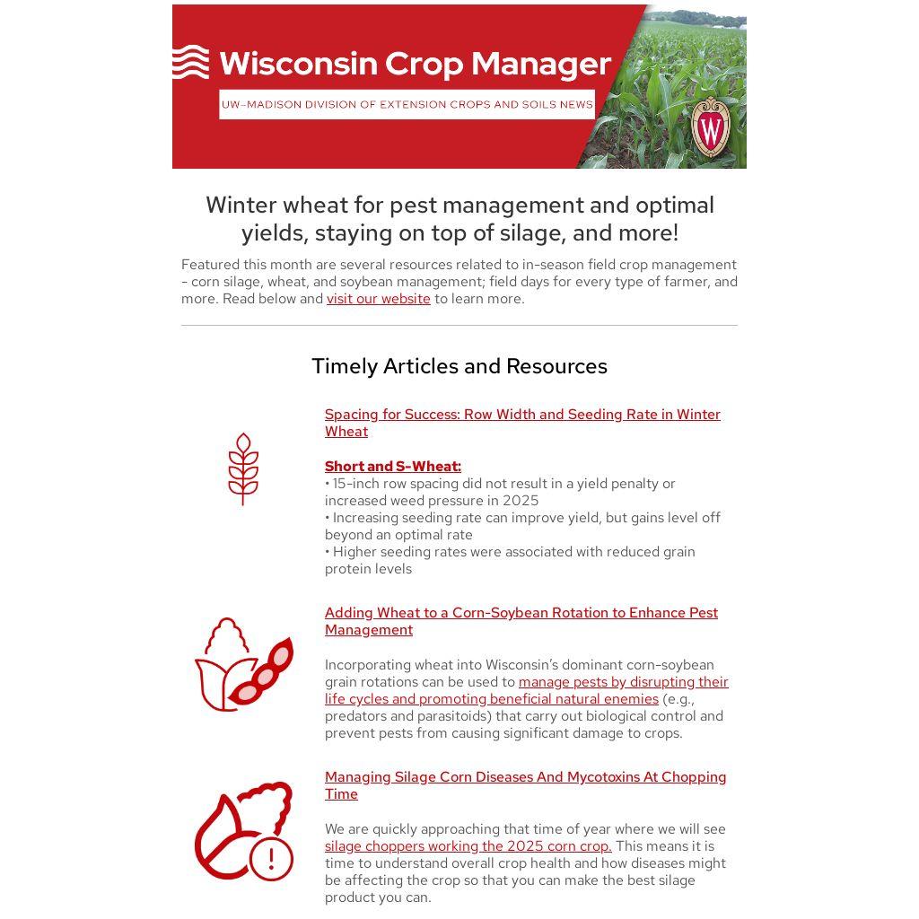 Featured this month are several resources related to in-season field crop management - corn silage, wheat, and soybean management; field days for every type of farmer, and more. Read below and visit our website to learn more.