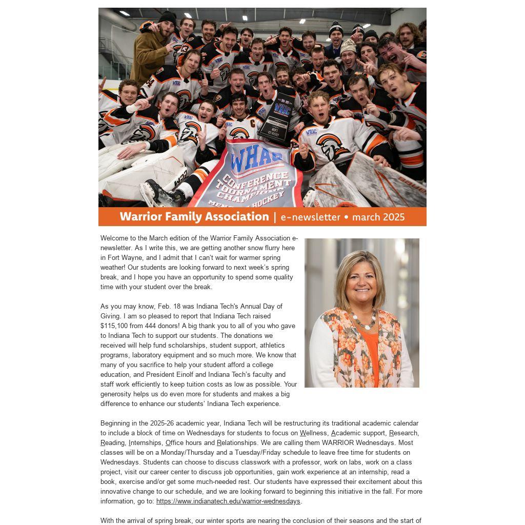 Welcome to the March edition of the Warrior Family Association e-newsletter. As I write this, we are getting another snow flurry here in Fort Wayne, and I admit that I can’t wait for warmer spring weather! Our students are looking forward to next week’s spring break, and I hope you have an opportunity to spend some quality time with your student over the break.