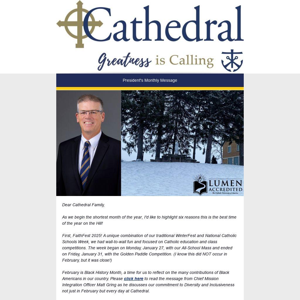 Thank you for your prayers and support of our beloved Cathedral High School. We sincerely appreciate the prayers, and support of any kind is greatly appreciated. I hope to see you at any of our February events, and perhaps our auction on the 22nd. Until then, be well, may God be praised, and Go Irish!