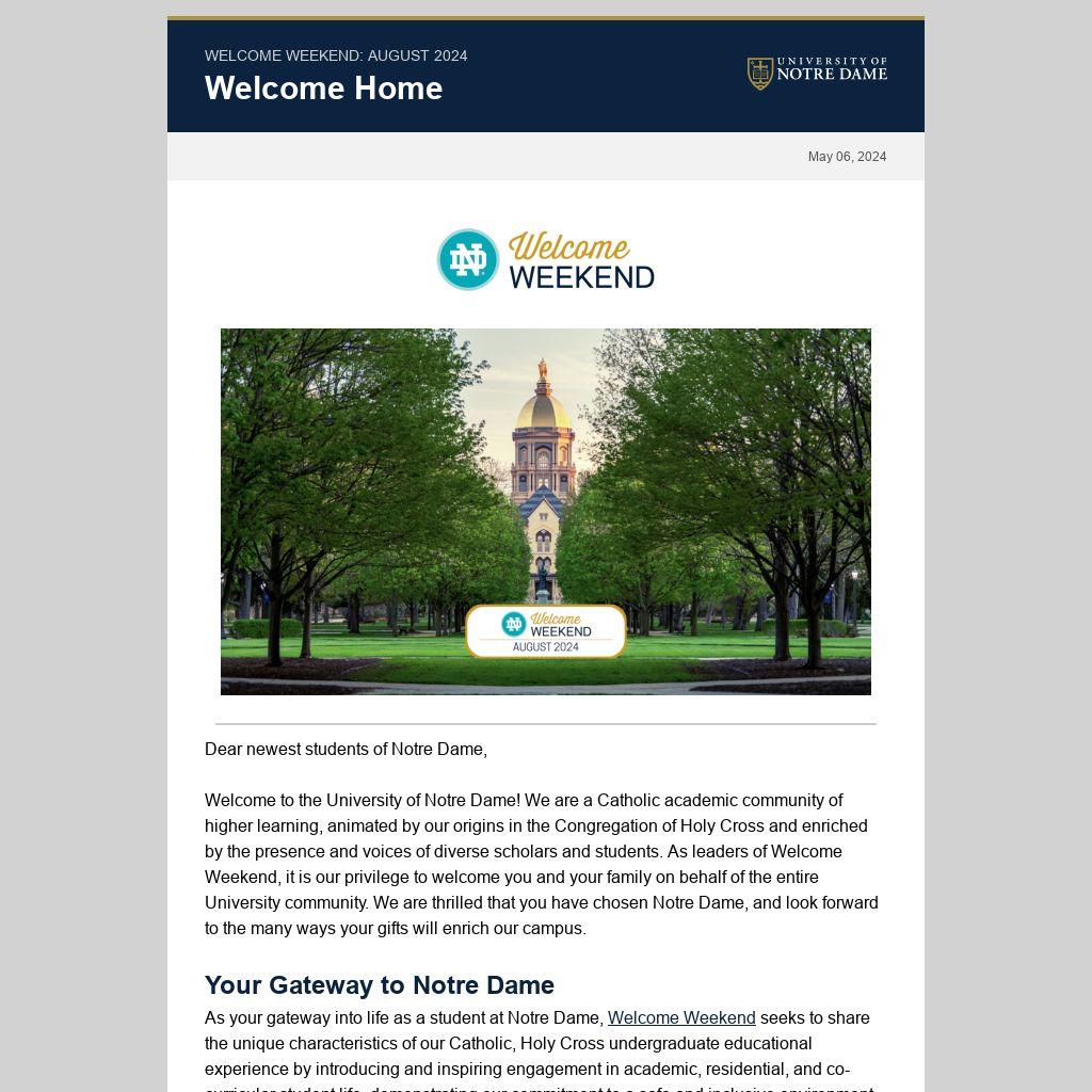 Welcome to the University of Notre Dame! We are a Catholic academic community of higher learning, animated by our origins in the Congregation of Holy Cross and enriched by the presence and voices of diverse scholars and students. As leaders of Welcome Weekend, it is our privilege to welcome you and your family on behalf of the entire University community. We are thrilled that you have chosen Notre Dame, and look forward to the many ways your gifts will enrich our campus.