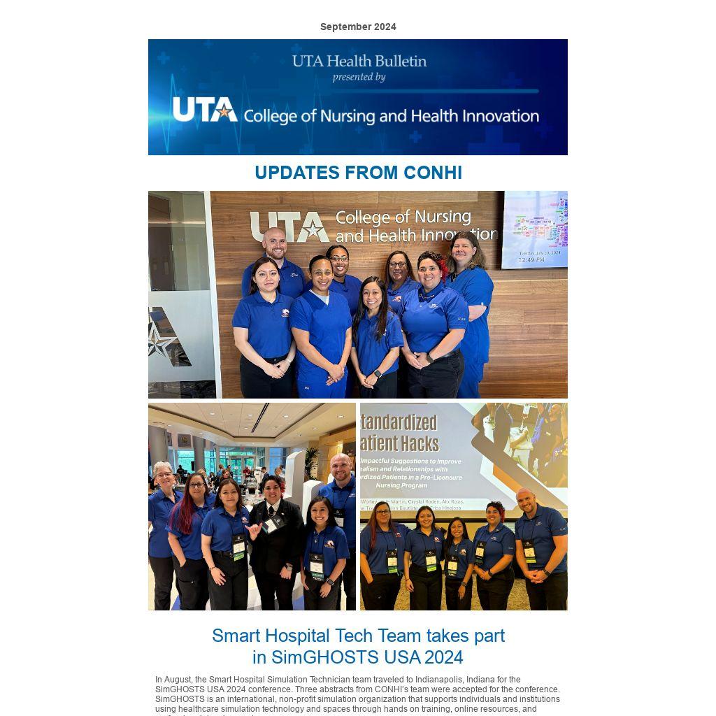 In August, the Smart Hospital Simulation Technician team traveled to Indianapolis, Indiana for the SimGHOSTS USA 2024 conference. Three abstracts from CONHI’s team were accepted for the conference. SimGHOSTS is an international, non-profit simulation organization that supports individuals and institutions using healthcare simulation technology and spaces through hands on training, online resources, and professional development.