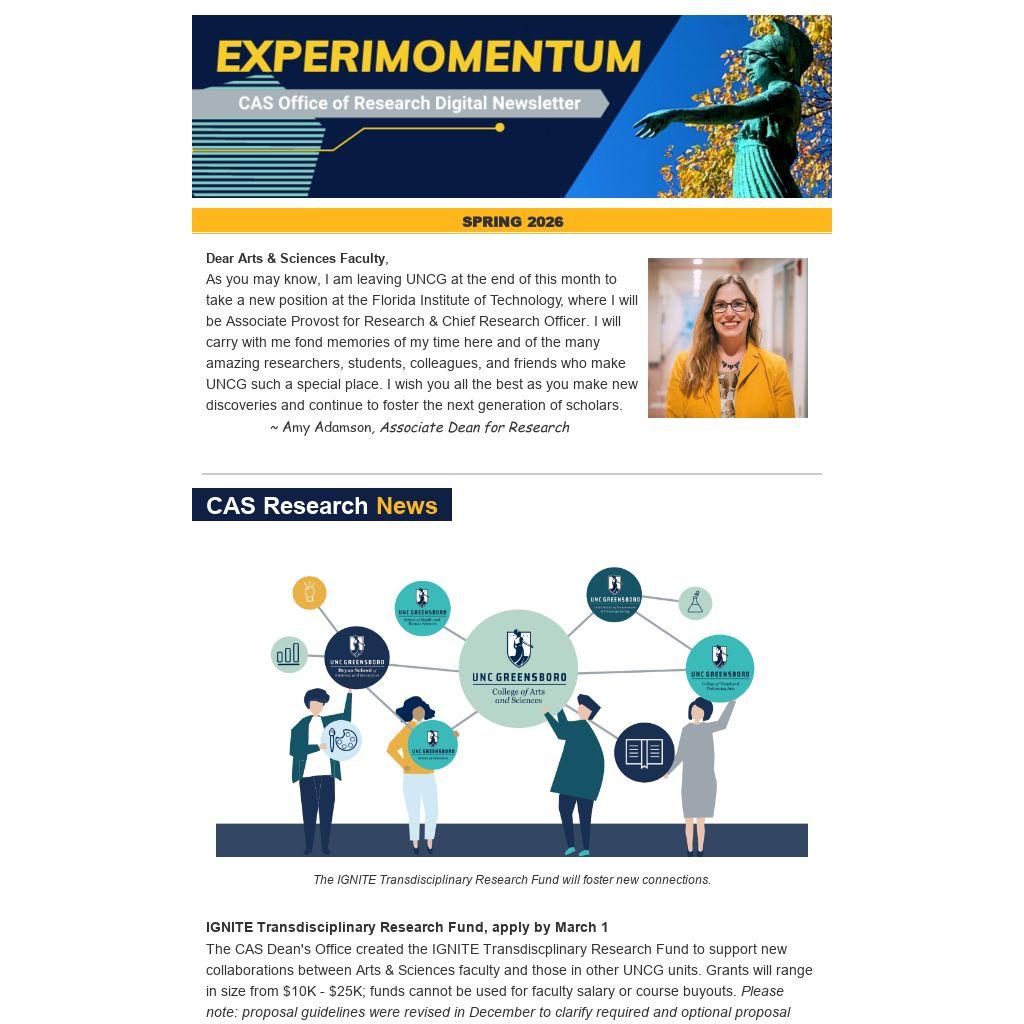 Dear Arts & Sciences Faculty, As you may know, I am leaving UNCG at the end of this month to take a new position at the Florida Institute of Technology, where I will be Associate Provost for Research & Chief Research Officer. I will carry with me fond memories of my time here and of the many amazing researchers, students, colleagues, and friends who make UNCG such a special place. I wish you all the best as you make new discoveries and continue to foster the next generation of scholars. ~ Amy Adamson, Associate Dean for Research