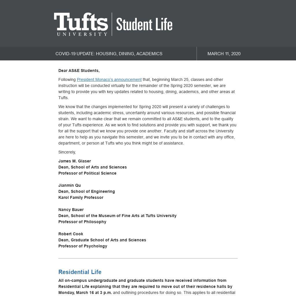 We know that the changes implemented for Spring 2020 will present a variety of challenges to students, including academic stress, uncertainty around various resources, and possible financial strain. We want to make clear that we remain committed to all AS&E students, and to the quality of your Tufts experience. As we work to find solutions and provide you with support, we thank you for all the support that we know you provide one another. Faculty and staff across the University are here to help as you navigate this semester, and we invite you to be in contact with any office, department, or person at Tufts who you think might be of assistance.