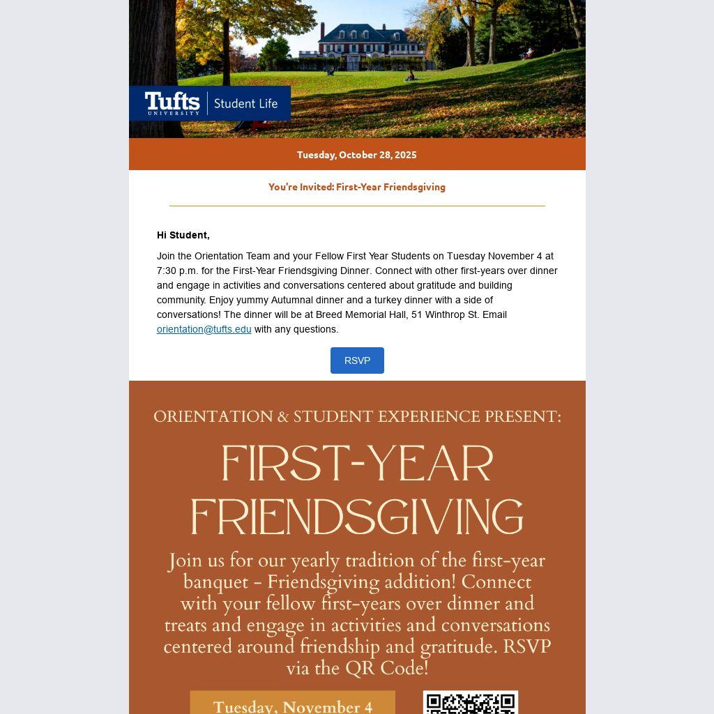 Join the Orientation Team and your Fellow First Year Students on Tuesday November 4 at 7:30 p.m. for the First-Year Friendsgiving Dinner. Connect with other first-years over dinner and engage in activities and conversations centered about gratitude and building community. Enjoy yummy Autumnal dinner and a turkey dinner with a side of conversations! The dinner will be at Breed Memorial Hall, 51 Winthrop St. Email orientation@tufts.edu with any questions.