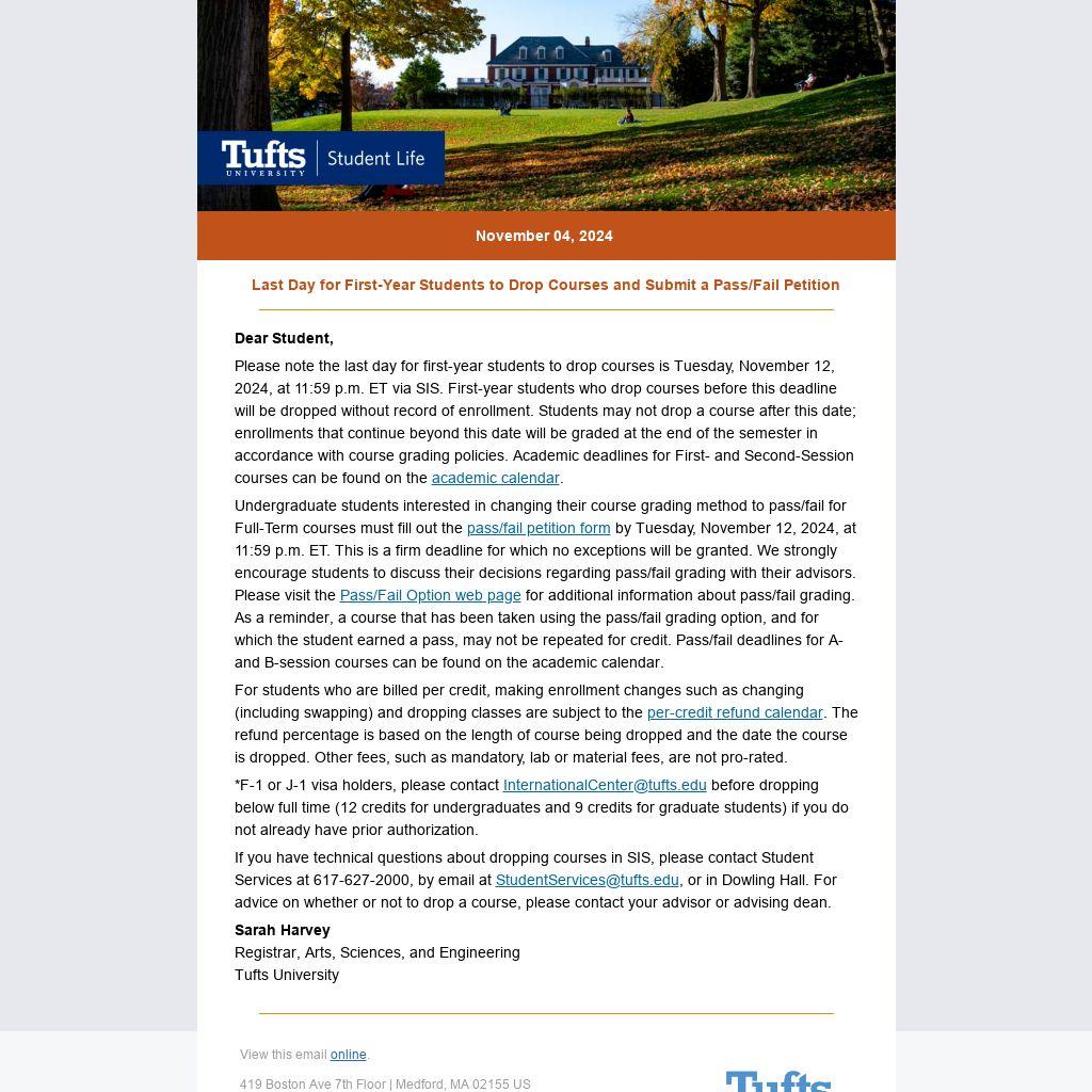 *F-1 or J-1 visa holders, please contact InternationalCenter@tufts.edu before dropping below full time (12 credits for undergraduates and 9 credits for graduate students) if you do not already have prior authorization.