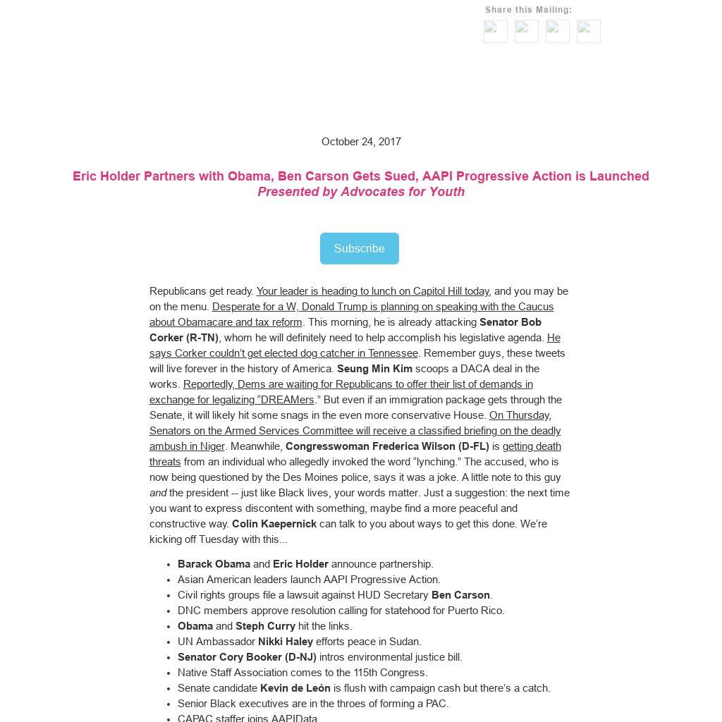 Republicans get ready. Your leader is heading to lunch on Capitol Hill today, and you may be on the menu. Desperate for a W, Donald Trump is planning on speaking with the Caucus about Obamacare and tax reform. This morning, he is already attacking Senator Bob Corker (R-TN), whom he will definitely need to help accomplish his legislative agenda. He says Corker couldn’t get elected dog catcher in Tennessee. Remember guys, these tweets will live forever in the history of America. Seung Min Kim scoops a DACA deal in the works. Reportedly, Dems are waiting for Republicans to offer their list of demands in exchange for legalizing “DREAMers.” But even if an immigration package gets through the Senate, it will likely hit some snags in the even more conservative House. On Thursday, Senators on the Armed Services Committee will receive a classified briefing on the deadly ambush in Niger. Meanwhile, Congresswoman Frederica Wilson (D-FL) is getting death threats from an individual who allegedly invoked the word “lynching.” The accused, who is now being questioned by the Des Moines police, says it was a joke. A little note to this guy and the president -- just like Black lives, your words matter. Just a suggestion: the next time you want to express discontent with something, maybe find a more peaceful and constructive way. Colin Kaepernick can talk to you about ways to get this done. We’re kicking off Tuesday with this...