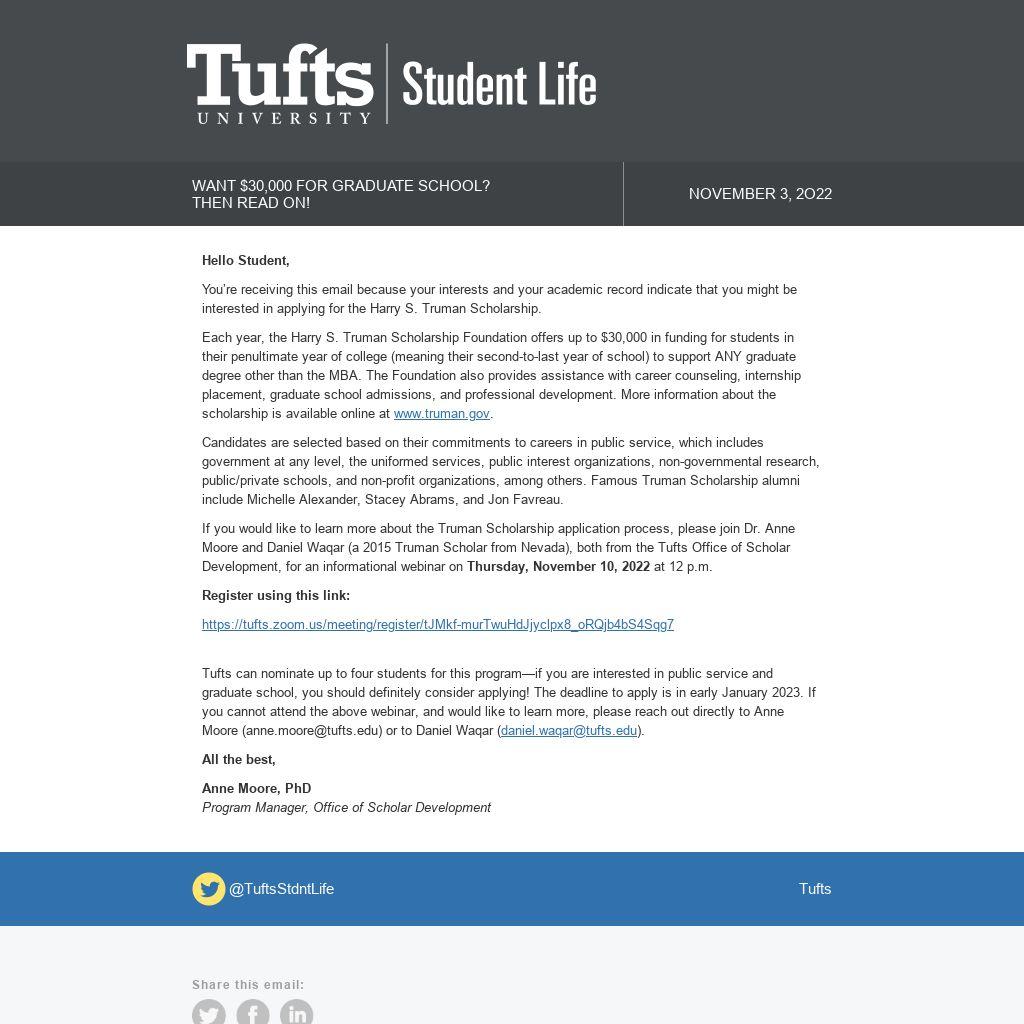 If you would like to learn more about the Truman Scholarship application process, please join Dr. Anne Moore and Daniel Waqar (a 2015 Truman Scholar from Nevada), both from the Tufts Office of Scholar Development, for an informational webinar on Thursday, November 10, 2022 at 12 p.m.