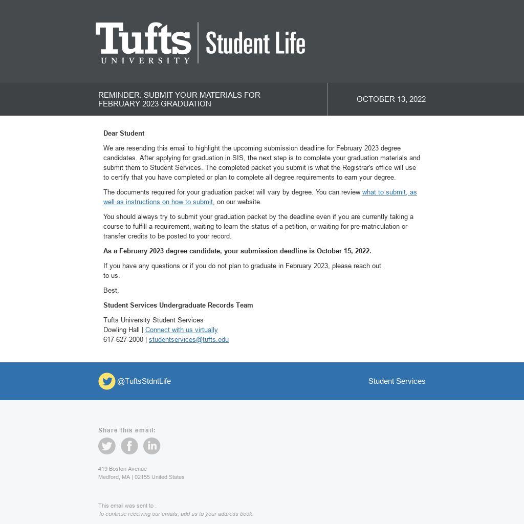 We are resending this email to highlight the upcoming submission deadline for February 2023 degree candidates. After applying for graduation in SIS, the next step is to complete your graduation materials and submit them to Student Services. The completed packet you submit is what the Registrar's office will use to certify that you have completed or plan to complete all degree requirements to earn your degree.