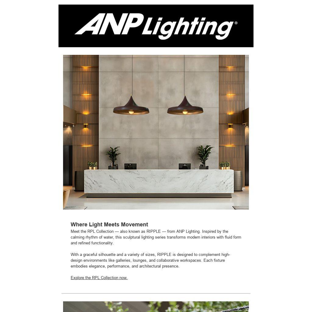 Where Light Meets MovementMeet the RPL Collection — also known as RIPPLE — from ANP Lighting. Inspired by the calming rhythm of water, this sculptural lighting series transforms modern interiors with fluid form and refined functionality.