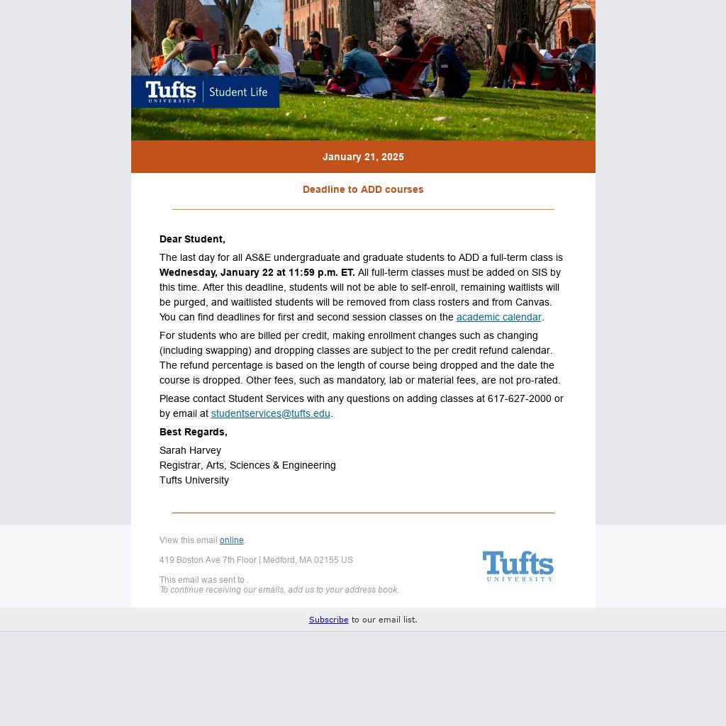 Please contact Student Services with any questions on adding classes at 617-627-2000 or by email at studentservices@tufts.edu.