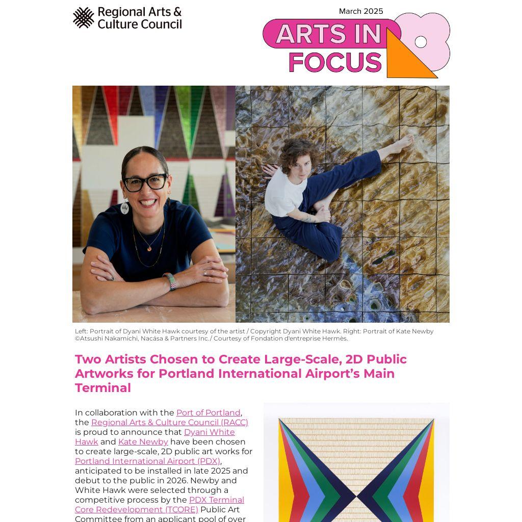 In collaboration with the Port of Portland, the Regional Arts & Culture Council (RACC) is proud to announce that Dyani White Hawk and Kate Newby have been chosen to create large-scale, 2D public art works for Portland International Airport (PDX), anticipated to be installed in late 2025 and debut to the public in 2026. Newby and White Hawk were selected through a competitive process by the PDX Terminal Core Redevelopment (TCORE) Public Art Committee from an applicant pool of over 110 artists and artist teams from across the United States.