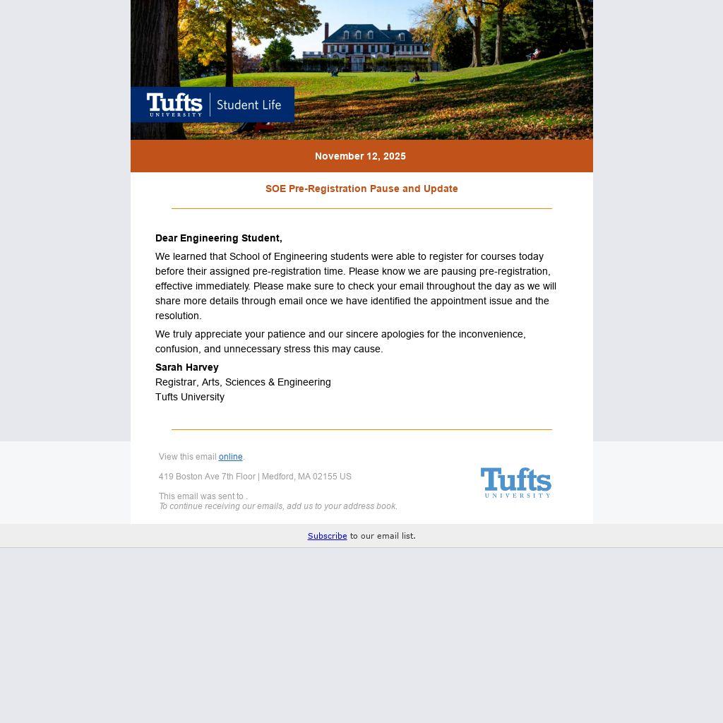 We learned that School of Engineering students were able to register for courses today before their assigned pre-registration time. Please know we are pausing pre-registration, effective immediately. Please make sure to check your email throughout the day as we will share more details through email once we have identified the appointment issue and the resolution.
