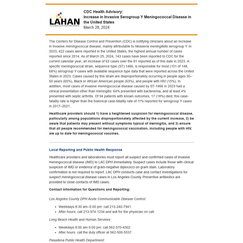 The Centers for Disease Control and Prevention (CDC) is notifying clinicians about an increase in invasive meningococcal disease, mainly attributable to Neisseria meningitidis serogroup Y. In 2023, 422 cases were reported in the United States, the highest annual number of cases reported since 2014. As of March 25, 2024, 143 cases have been reported to CDC for the current calendar year, an increase of 62 cases over the 81 reported as of this date in 2023. A specific meningococcal strain, sequence type (ST) 1466, is responsible for most (101 of 148, 68%) serogroup Y cases with available sequence type data that were reported across the United States in 2023. Cases caused by this strain are disproportionately occurring in people ages 30–60 years (65%), Black or African American people (63%), and people with HIV (15%). In addition, most cases of invasive meningococcal disease caused by ST-1466 in 2023 had a clinical presentation other than meningitis: 64% presented with bacteremia, and at least 4% presented with septic arthritis. Of 94 patients with known outcomes, 17 (18%) died; this case-fatality rate is higher than the historical case-fatality rate of 11% reported for serogroup Y cases in 2017–2021.