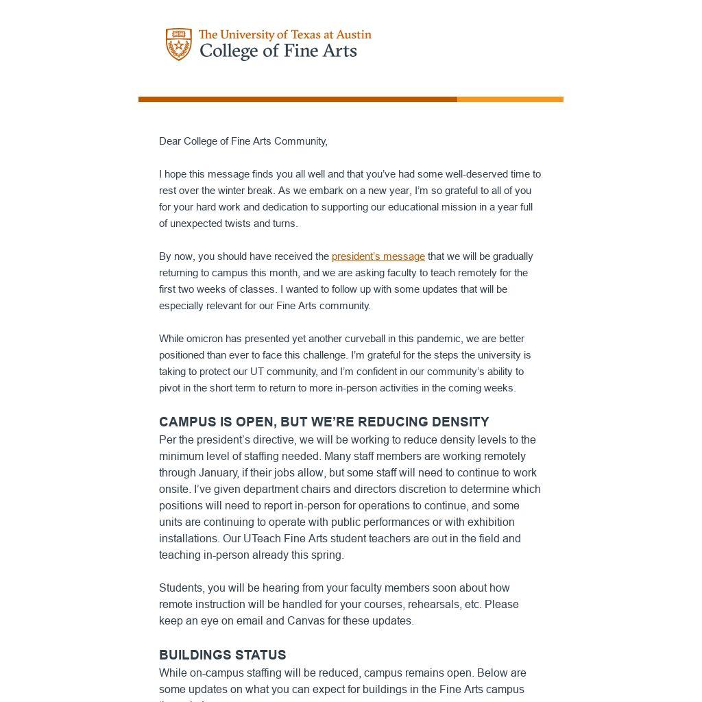 Per the president’s directive, we will be working to reduce density levels to the minimum level of staffing needed. Many staff members are working remotely through January, if their jobs allow, but some staff will need to continue to work onsite. I’ve given department chairs and directors discretion to determine which positions will need to report in-person for operations to continue, and some units are continuing to operate with public performances or with exhibition installations. Our UTeach Fine Arts student teachers are out in the field and teaching in-person already this spring.