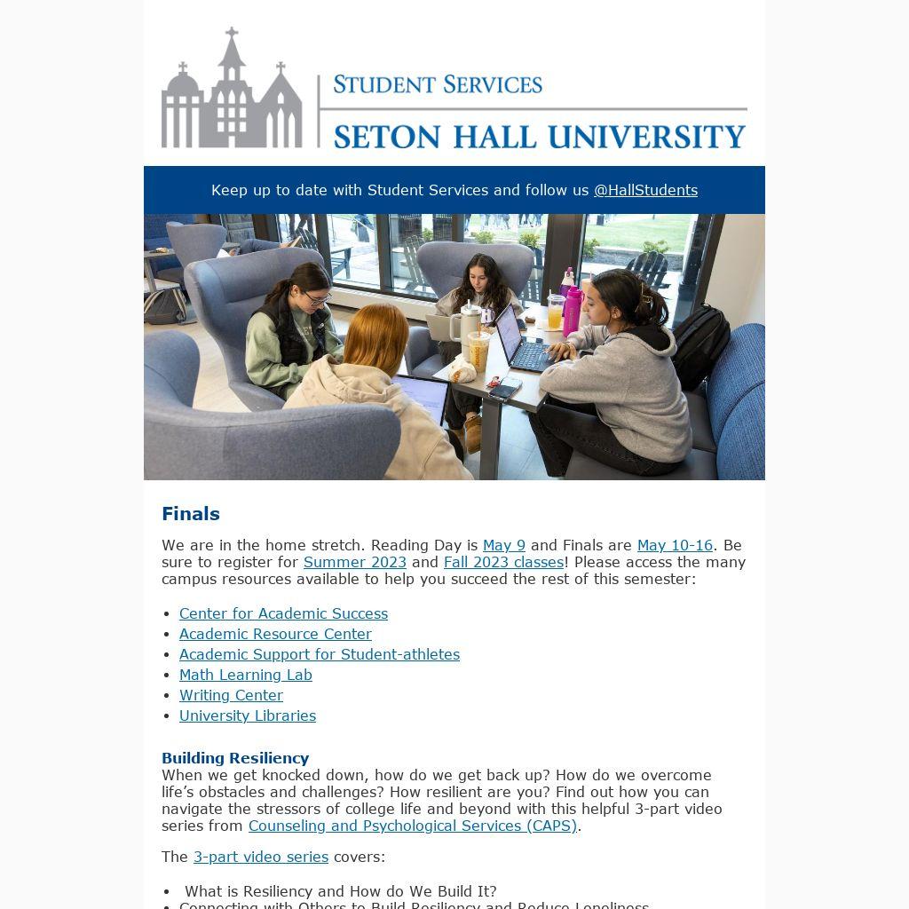 We are in the home stretch. Reading Day is May 9 and Finals are May 10-16. Be sure to register for Summer 2023 and Fall 2023 classes! Please access the many campus resources available to help you succeed the rest of this semester:
