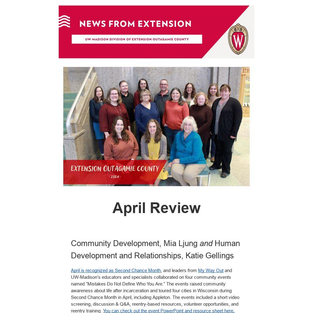 Lastly, I’ve been planning for Summer programming: community gardens and the Gleaning Program at the Downtown Appleton Farm Market. The Gleaning Program will help decrease food insecurity and food waste through farmer donations of excess produce at the end of the market. The produce will go to local food pantries, mini-free pantries, and other participating locations. As we head into the Summer months, I am looking for volunteers to help with this. Please contact me at miranda.dawson@wisc.edu if you are interested in volunteering.