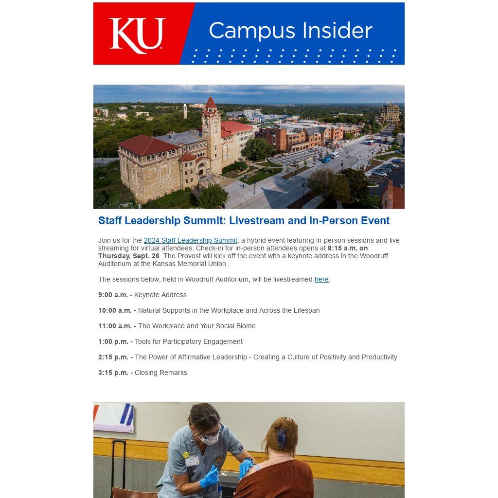 Join us for the 2024 Staff Leadership Summit, a hybrid event featuring in-person sessions and live streaming for virtual attendees. Check-in for in-person attendees opens at 8:15 a.m. on Thursday, Sept. 26. The Provost will kick off the event with a keynote address in the Woodruff Auditorium at the Kansas Memorial Union.