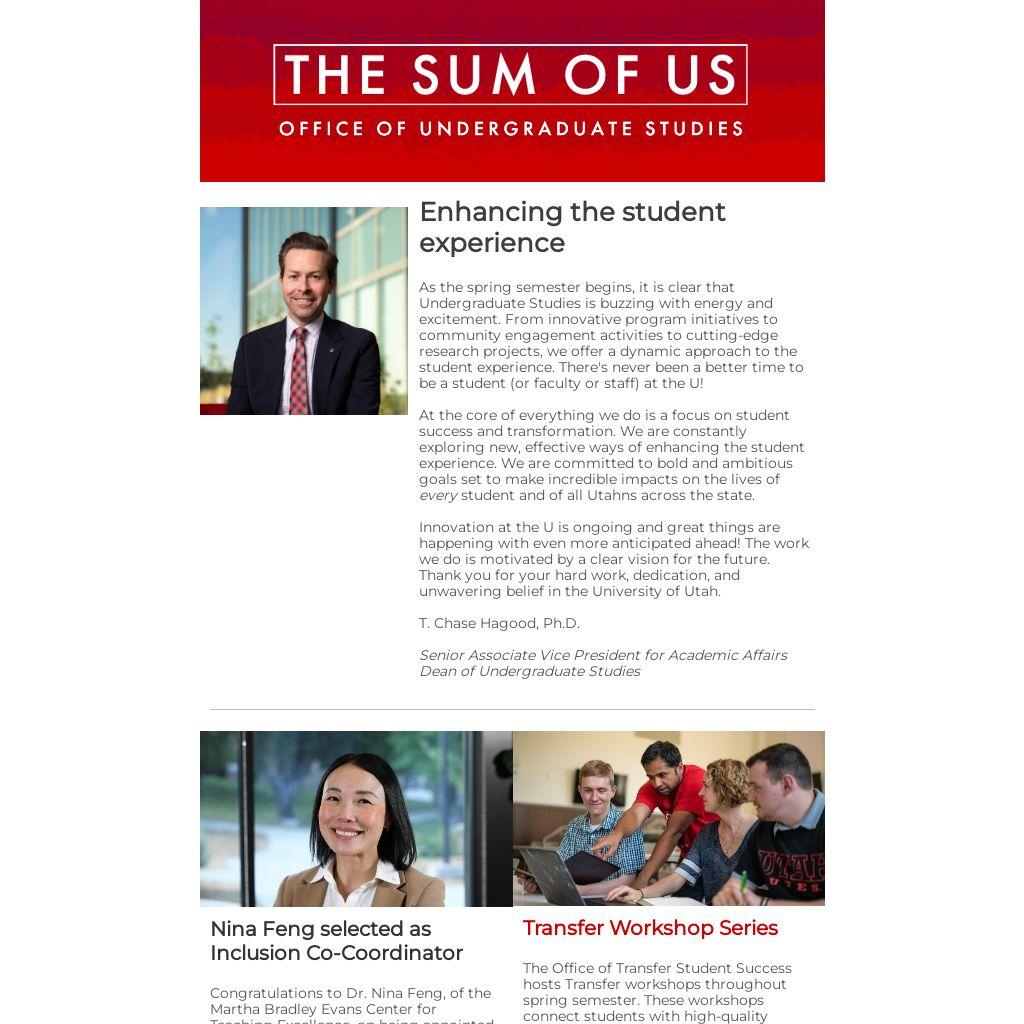 As the spring semester begins, it is clear that Undergraduate Studies is buzzing with energy and excitement. From innovative program initiatives to community engagement activities to cutting-edge research projects, we offer a dynamic approach to the student experience. There's never been a better time to be a student (or faculty or staff) at the U!