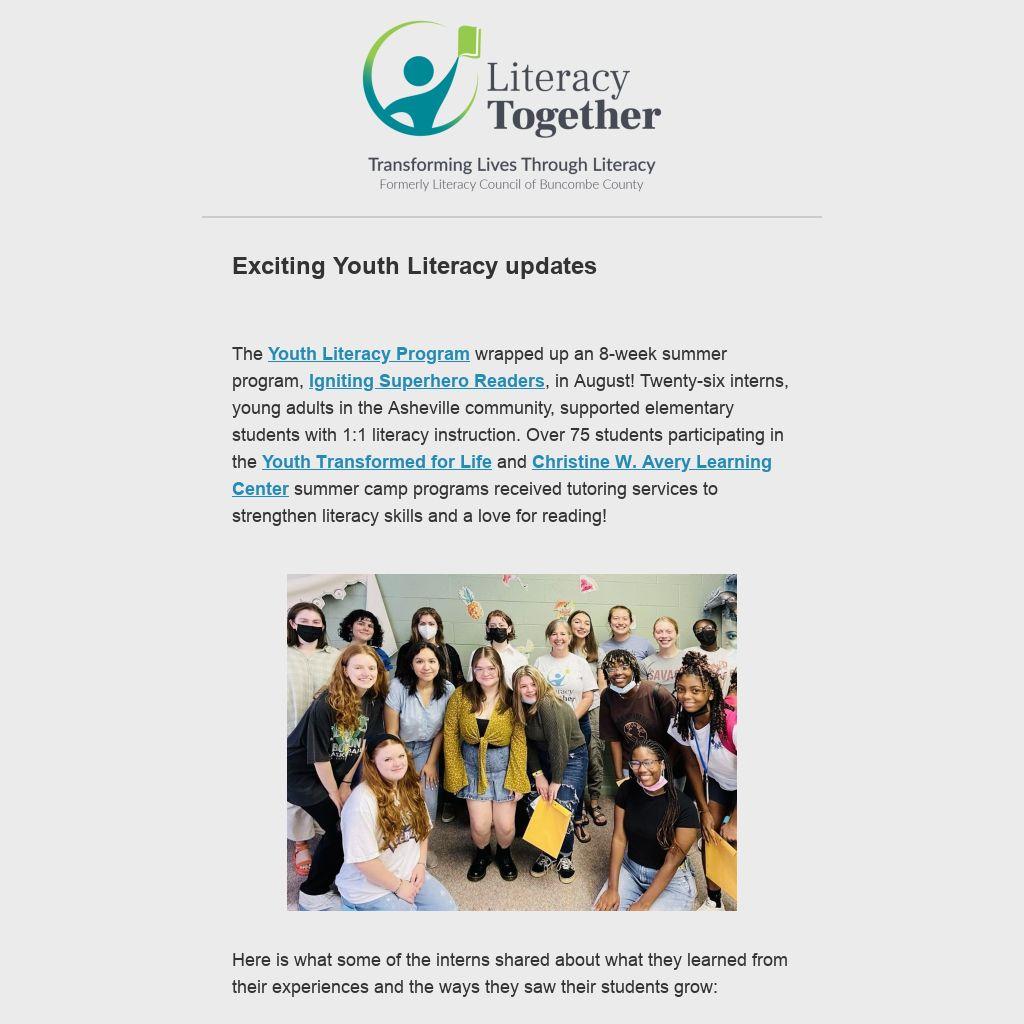 In addition, the Igniting Superhero Readers internship will continue throughout the school year, thanks to a grant from the City of Asheville! The interns will support elementary-age students in the YTL and Avery Learning Center after-school programs.