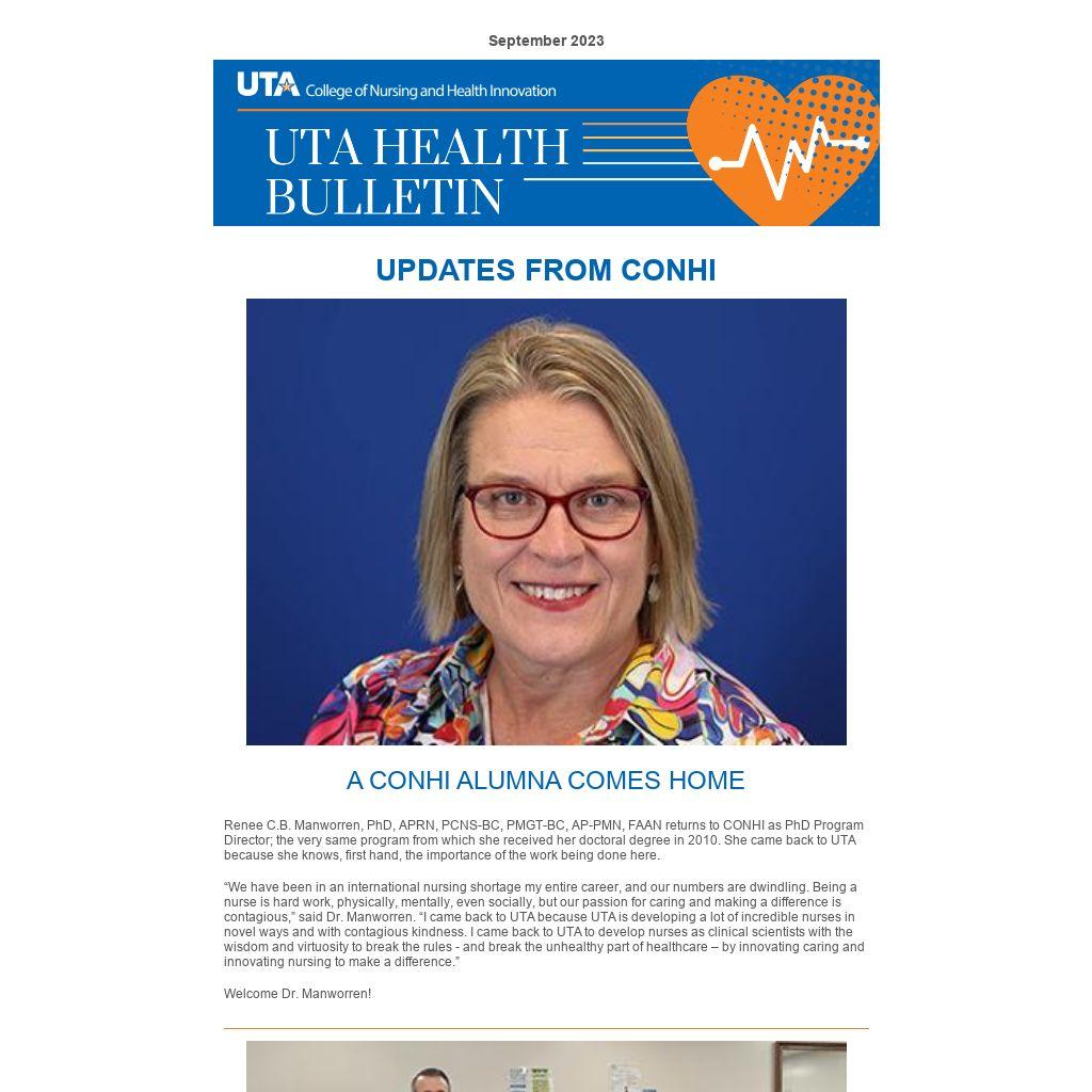 Renee C.B. Manworren, PhD, APRN, PCNS-BC, PMGT-BC, AP-PMN, FAAN returns to CONHI as PhD Program Director; the very same program from which she received her doctoral degree in 2010. She came back to UTA because she knows, first hand, the importance of the work being done here.