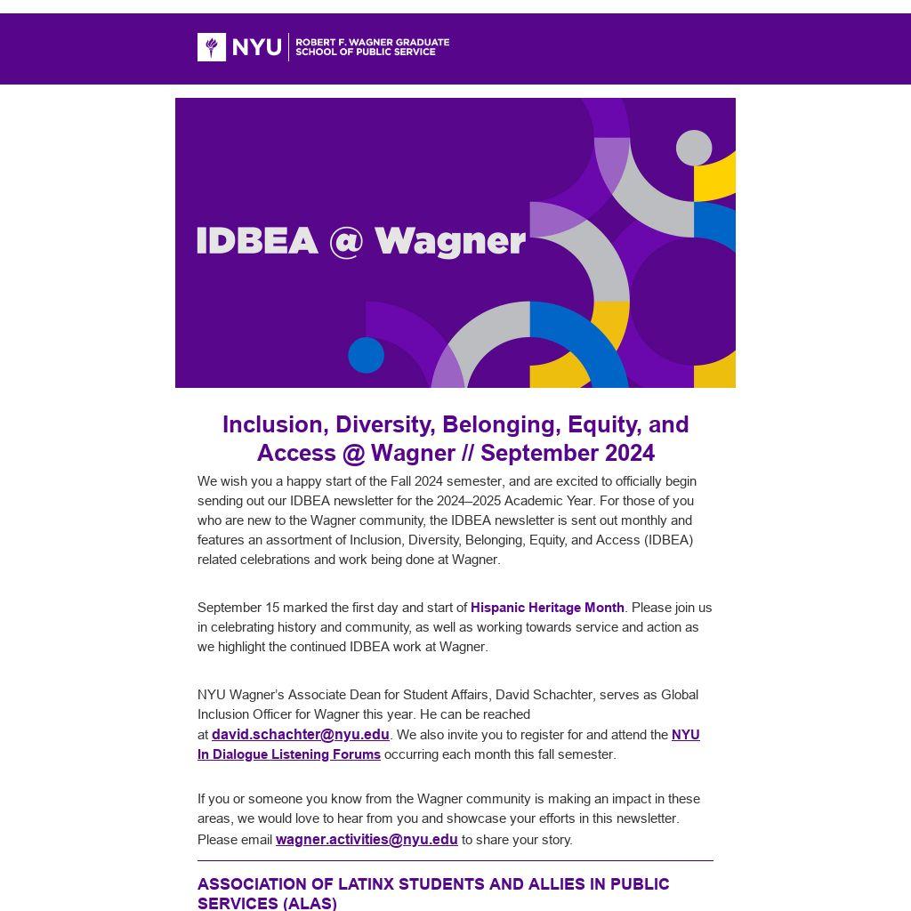 We wish you a happy start of the Fall 2024 semester, and are excited to officially begin sending out our IDBEA newsletter for the 2024–2025 Academic Year. For those of you who are new to the Wagner community, the IDBEA newsletter is sent out monthly and features an assortment of Inclusion, Diversity, Belonging, Equity, and Access (IDBEA) related celebrations and work being done at Wagner.