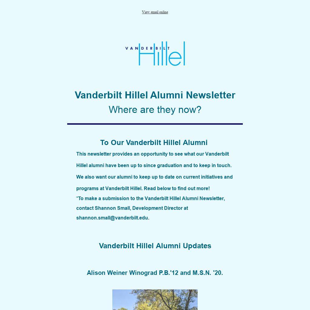 To Our Vanderbilt Hillel Alumni This newsletter provides an opportunity to see what our Vanderbilt Hillel alumni have been up to since graduation and to keep in touch. We also want our alumni to keep up to date on current initiatives and programs at Vanderbilt Hillel. Read below to find out more! *To make a submission to the Vanderbilt Hillel Alumni Newsletter, contact Shannon Small, Development Director at shannon.small@vanderbilt.edu.