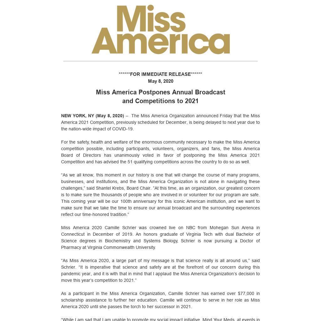 For the safety, health and welfare of the enormous community necessary to make the Miss America competition possible, including participants, volunteers, organizers, and fans, the Miss America Board of Directors has unanimously voted in favor of postponing the Miss America 2021 Competition and has advised the 51 qualifying competitions across the country to do so as well.