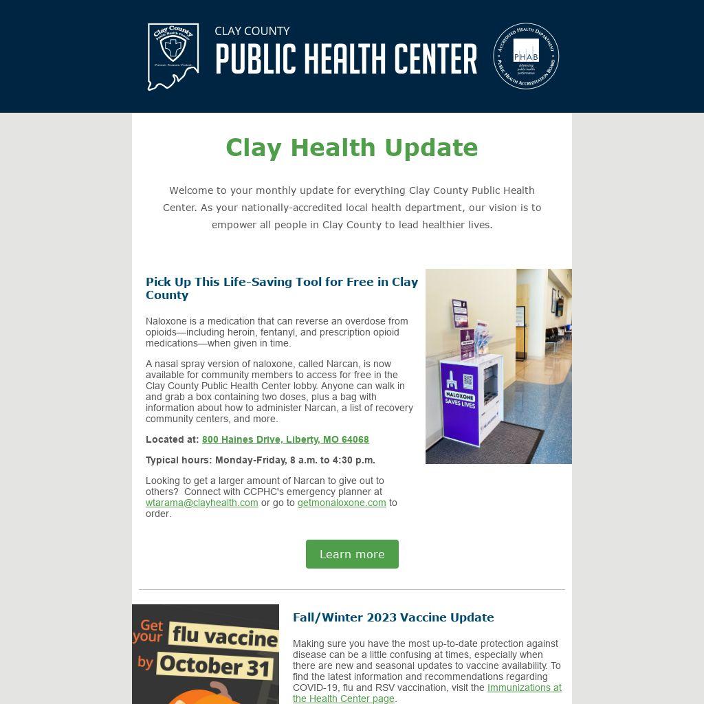 Welcome to your monthly update for everything Clay County Public Health Center. As your nationally-accredited local health department, our vision is to empower all people in Clay County to lead healthier lives.
