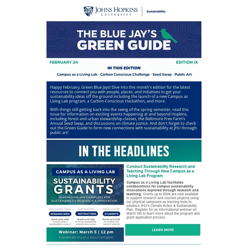 Campus as a Living Lab facilitates collaborations for campus sustainability innovations explored through research and teaching. Grants up to $50k are now available to support research and courses projects using our physical campuses as learning tools to advance JHU’s Climate Action & Sustainability Plan. Register for an informational webinar on March 5th to learn more about the program and grant application process.