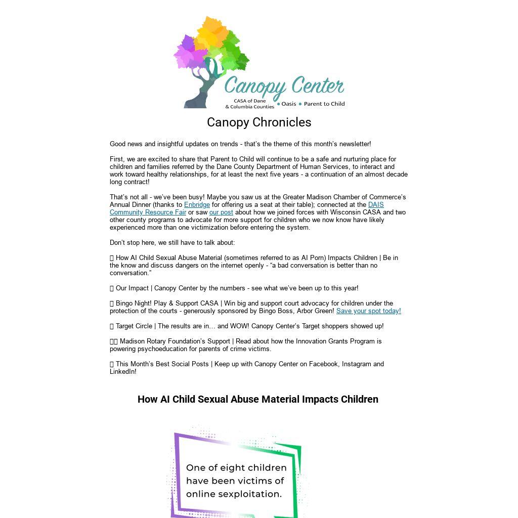 The rise of AI-generated child sexual abuse material (CSAM) presents new challenges for our community, particularly when it comes to protecting children - a cause that is particularly close to Canopy Center’s Oasis sexual abuse treatment program. Of those convicted for offenses related to child sexual abuse material, 98% either have a prior record of sexually abusing minors or disclosed such actions while undergoing treatment. While lawmakers debate how to address and criminalize the distribution of this type of content, it is crucial for caregivers and youth to be aware of this threat and the potential implications. AI-generated CSAM that mimics or portrays children blurs the line between virtual exploitation and real-world harm, raising concerns about how it could potentially desensitize viewers and normalize inappropriate behavior toward minors. The proliferation of such material also undermines efforts to prevent abuse by making it harder to distinguish between what is real and what is artificial.Â