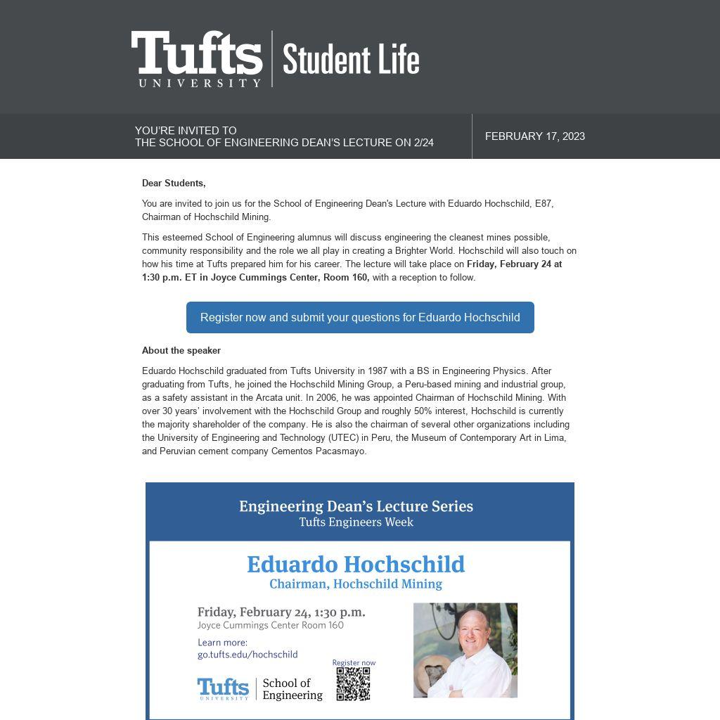 This esteemed School of Engineering alumnus will discuss engineering the cleanest mines possible, community responsibility and the role we all play in creating a Brighter World. Hochschild will also touch on how his time at Tufts prepared him for his career. The lecture will take place on Friday, February 24 at 1:30 p.m. ET in Joyce Cummings Center, Room 160, with a reception to follow.