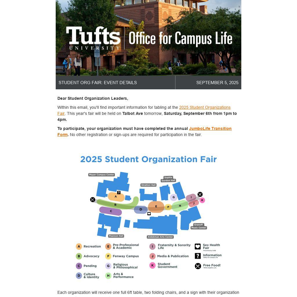 Within this email, you'll find important information for tabling at the 2025 Student Organizations Fair. This year's fair will be held on Talbot Ave tomorrow, Saturday, September 6th from 1pm to 4pm.