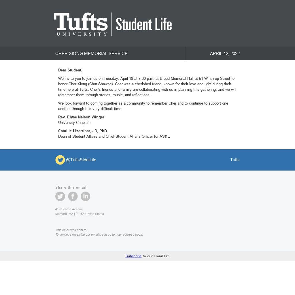 We invite you to join us on Tuesday, April 19 at 7:30 p.m. at Breed Memorial Hall at 51 Winthrop Street to honor Cher Xiong (Chur Shawng). Cher was a cherished friend, known for their love and light during their time here at Tufts. Cher’s friends and family are collaborating with us in planning this gathering, and we will remember them through stories, music, and reflections.