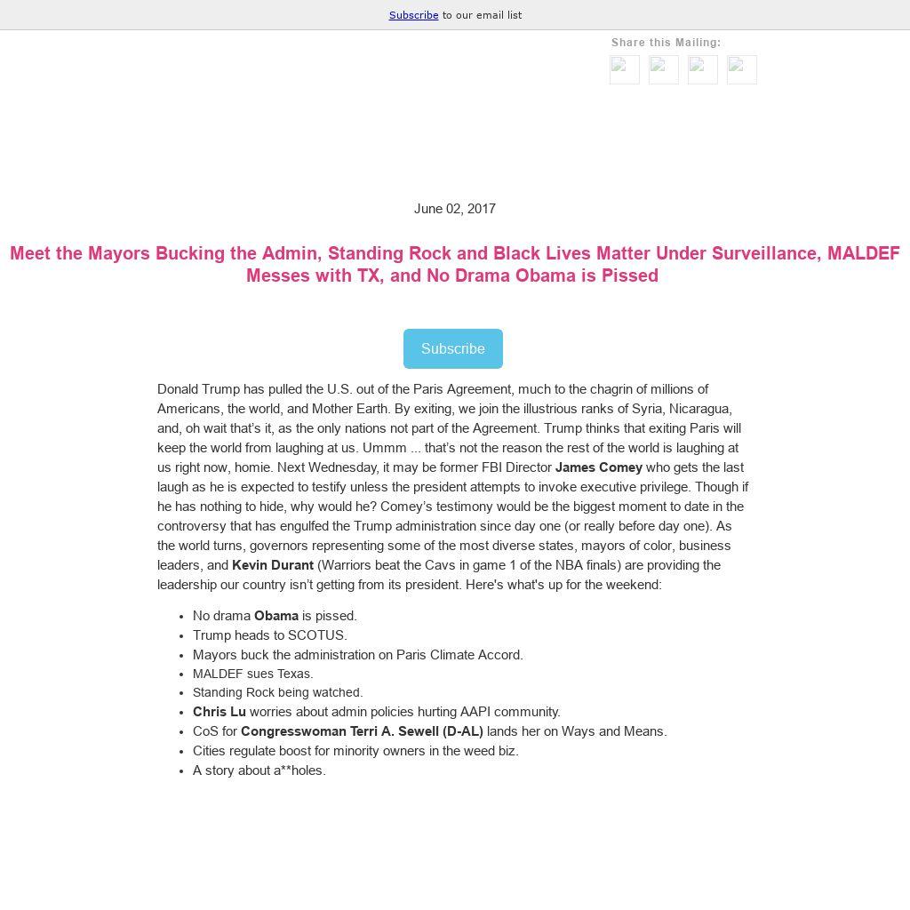 Donald Trump has pulled the U.S. out of the Paris Agreement, much to the chagrin of millions of Americans, the world, and Mother Earth. By exiting, we join the illustrious ranks of Syria, Nicaragua, and, oh wait that’s it, as the only nations not part of the Agreement. Trump thinks that exiting Paris will keep the world from laughing at us. Ummm ... that’s not the reason the rest of the world is laughing at us right now, homie. Next Wednesday, it may be former FBI Director James Comey who gets the last laugh as he is expected to testify unless the president attempts to invoke executive privilege. Though if he has nothing to hide, why would he? Comey’s testimony would be the biggest moment to date in the controversy that has engulfed the Trump administration since day one (or really before day one). As the world turns, governors representing some of the most diverse states, mayors of color, business leaders, and Kevin Durant (Warriors beat the Cavs in game 1 of the NBA finals) are providing the leadership our country isn’t getting from its president. Here's what's up for the weekend:- No drama Obama is pissed.