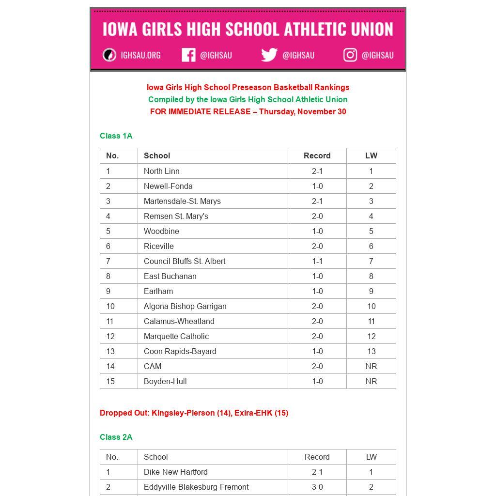 Iowa Girls High School Preseason Basketball Rankings