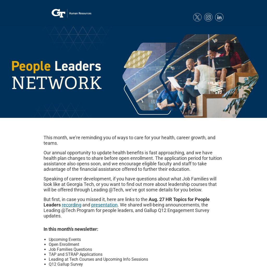 But first, in case you missed it, here are links to the Aug. 27 HR Topics for People Leaders recording and presentation. We shared well-being announcements, the Leading @Tech Program for people leaders, and Gallup Q12 Engagement Survey updates.