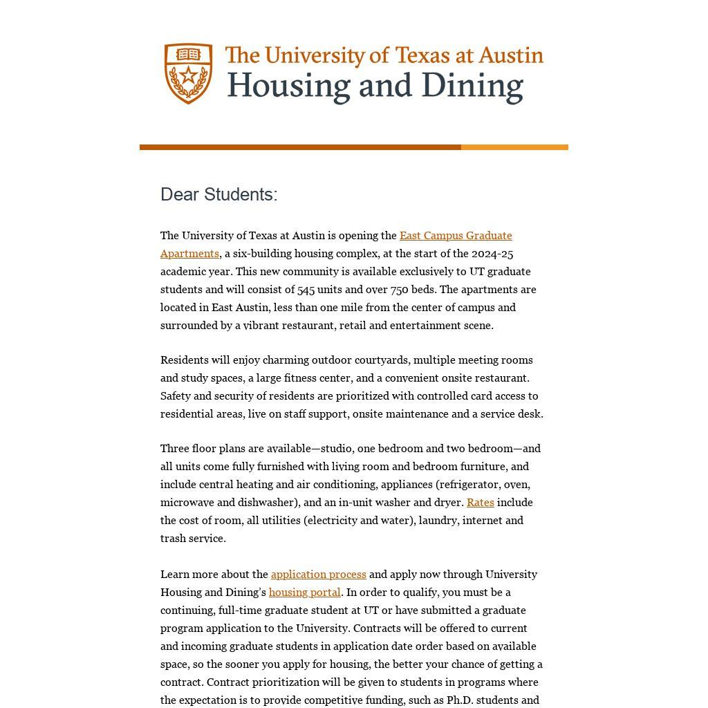 The University of Texas at Austin is opening the East Campus Graduate Apartments, a six-building housing complex, at the start of the 2024-25 academic year. This new community is available exclusively to UT graduate students and will consist of 545 units and over 750 beds. The apartments are located in East Austin, less than one mile from the center of campus and surrounded by a vibrant restaurant, retail and entertainment scene.