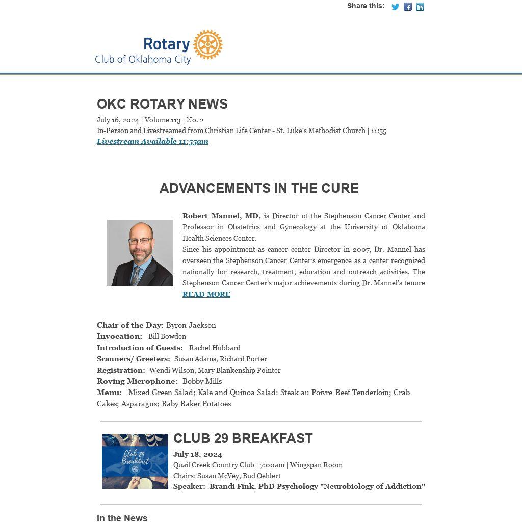 Rotary Club 29 has an online membership directory which contains current content information for all club members. The link to access the Club 29 directory can be found at the top of the home page of okcrotary.club or by clicking here. OKC Rotary has provided this tool as a convenience to help members stay in touch with one another. The online directory, just like the printed roster, should only be used for Rotary purposes. If you need help in accessing the directory, please email the office.