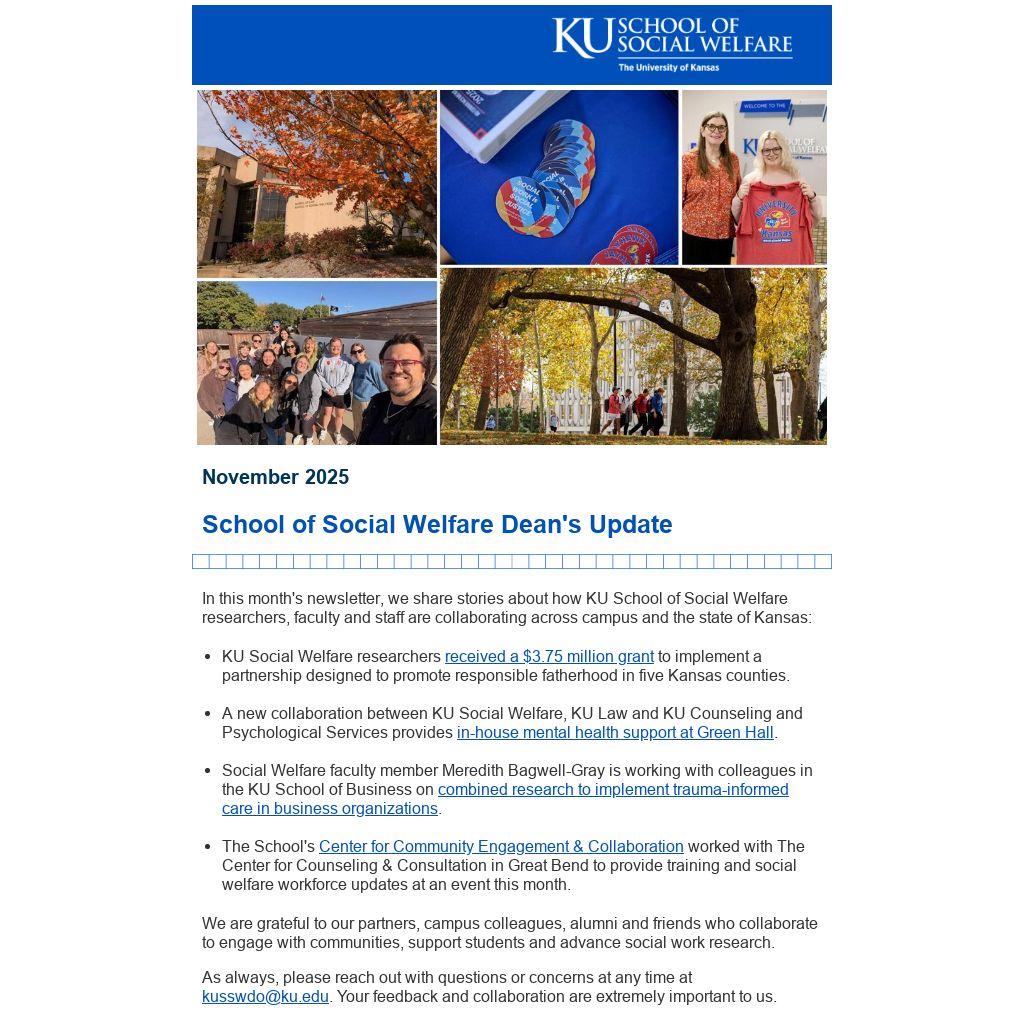 In this month's newsletter, we share stories about how KU School of Social Welfare researchers, faculty and staff are collaborating across campus and the state of Kansas: