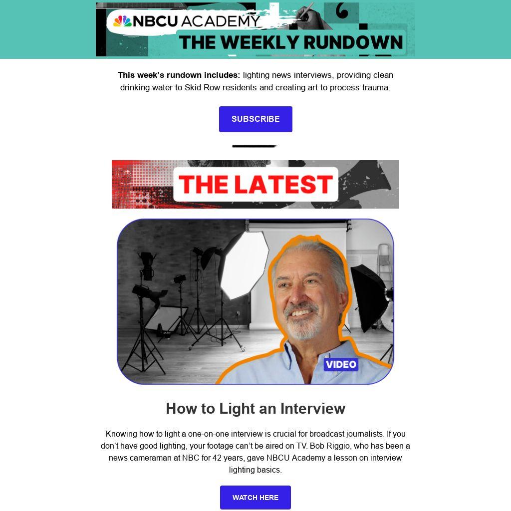 Knowing how to light a one-on-one interview is crucial for broadcast journalists. If you don’t have good lighting, your footage can’t be aired on TV. Bob Riggio, who has been a news cameraman at NBC for 42 years, gave NBCU Academy a lesson on interview lighting basics.