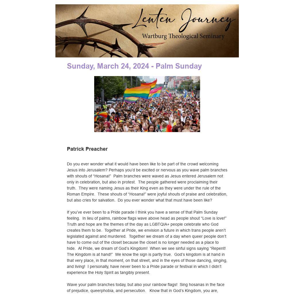 Wave your palm branches today, but also your rainbow flags! Sing hosanas in the face of prejudice, queerphobia, and persecution. Know that in God’s Kingdom, you are, without exception, loved, honored, valued, affirmed, welcomed, and celebrated!