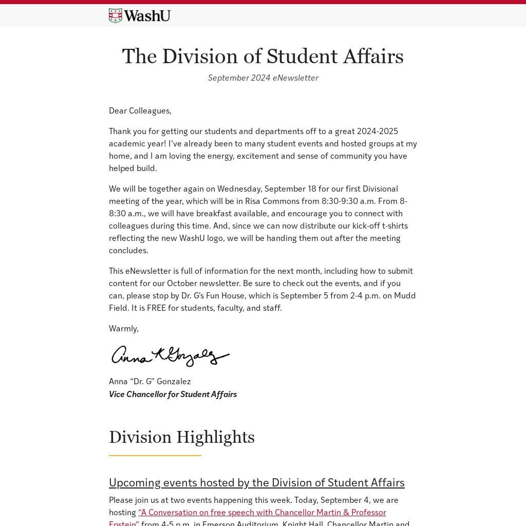 The Student Affairs eNewsletter is sent the first Tuesday of each month. If your department has content you would like featured, submit via the link below at least a week prior to the edition you would like to be included in.