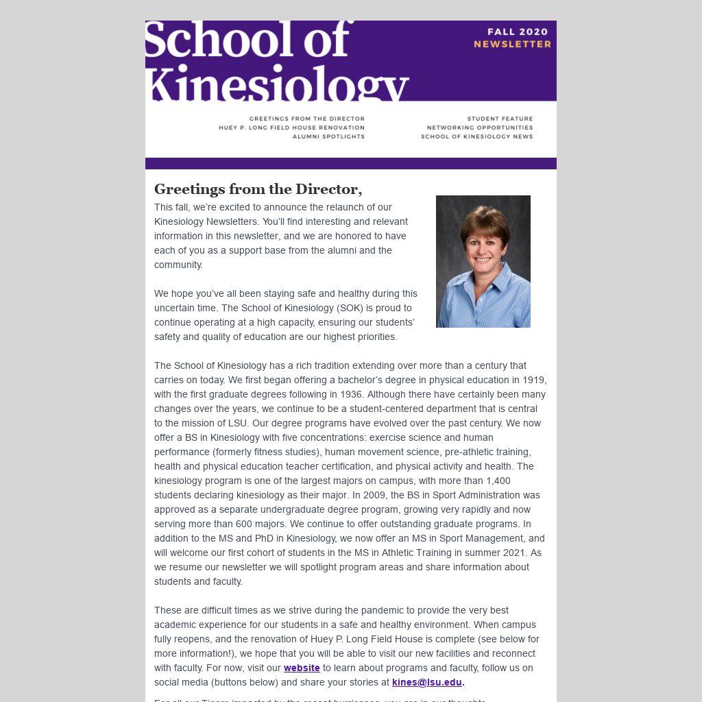 Greetings from the Director, This fall, we’re excited to announce the relaunch of our Kinesiology Newsletters. You’ll find interesting and relevant information in this newsletter, and we are honored to have each of you as a support base from the alumni and the community.