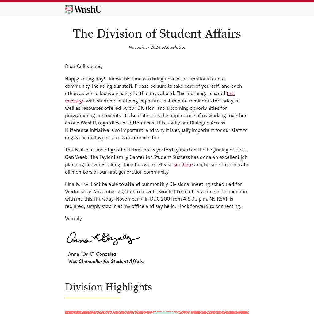 Happy voting day! I know this time can bring up a lot of emotions for our community, including our staff. Please be sure to take care of yourself, and each other, as we collectively navigate the days ahead. This morning, I shared this message with students, outlining important last-minute reminders for today, as well as resources offered by our Division, and upcoming opportunities for programming and events. It also reiterates the importance of us working together as one WashU, regardless of differences. This is why our Dialogue Across Difference initiative is so important, and why it is equally important for our staff to engage in dialogues across difference, too.
