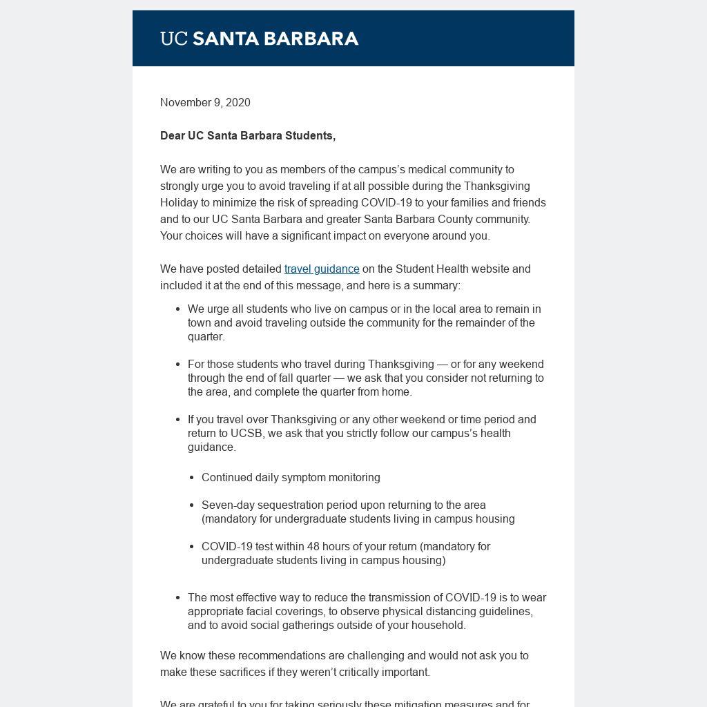 UCSB campus medical experts and Santa Barbara County Public Health officials strongly recommend that all students currently residing in the UCSB area (either on campus or in Isla Vista), remain in the area and avoid travel - particularly for the Thanksgiving Holiday. Avoiding travel during the academic year minimizes the risk of transmitting the COVID-19 virus to friends and family you visit, as well as to anyone you encounter while traveling. It also reduces the risk of bringing the virus back to our community from other areas when you return.
