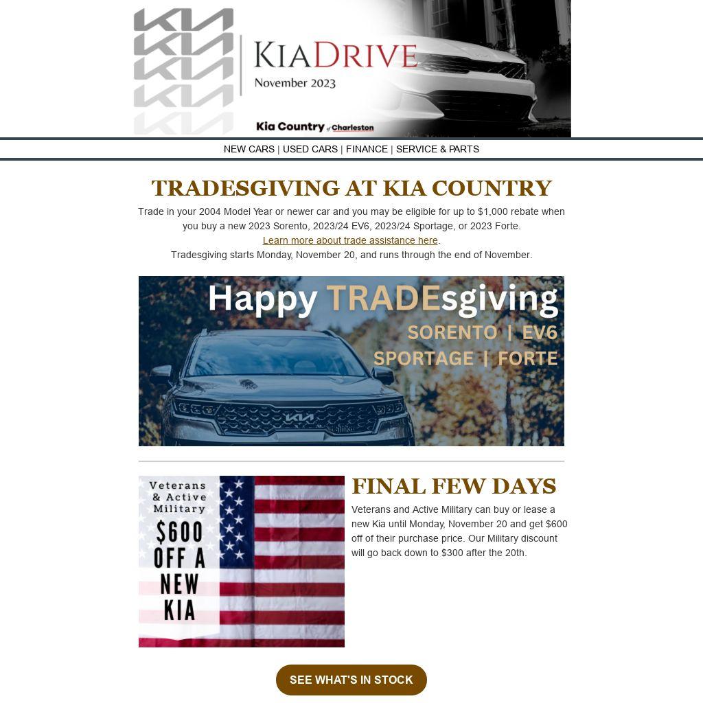 Veterans and Active Military can buy or lease a new Kia until Monday, November 20 and get $600 off of their purchase price. Our Military discount will go back down to $300 after the 20th.